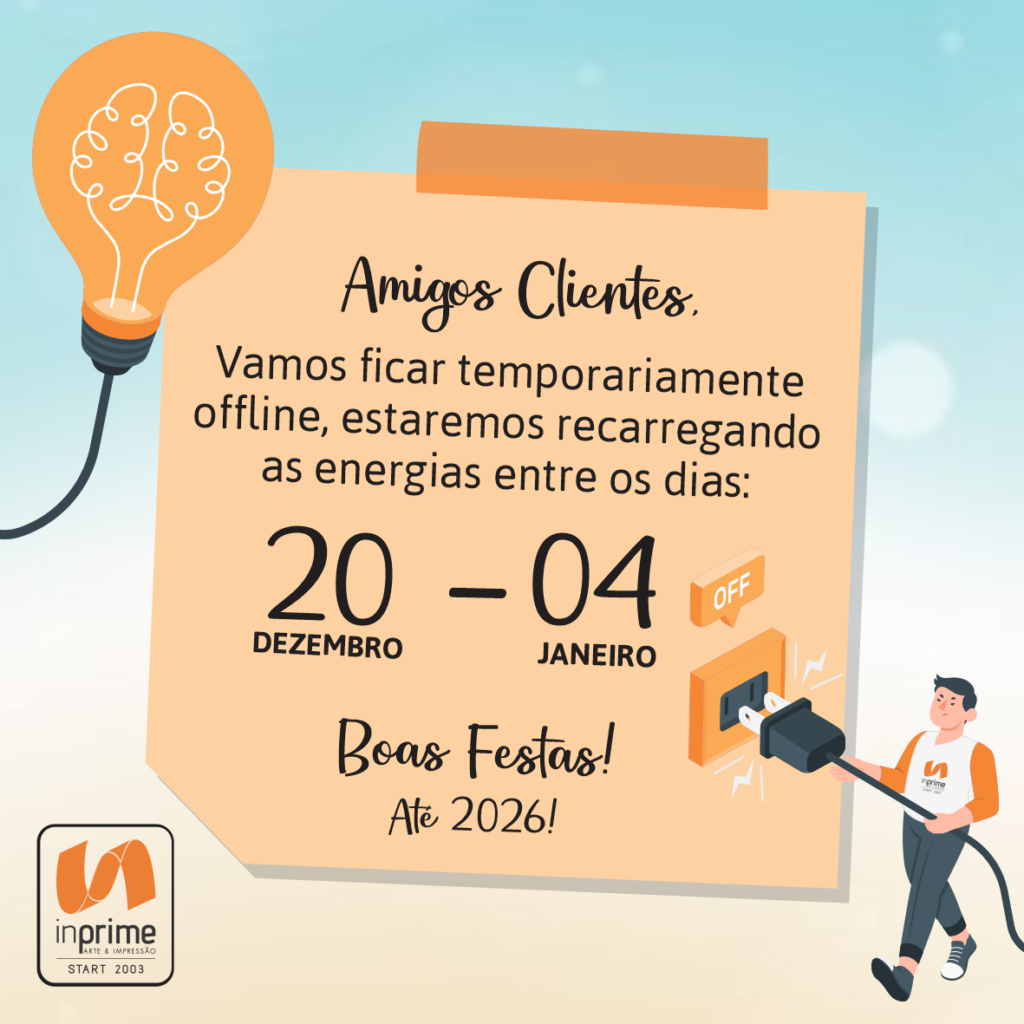 A equipe da Inprime Arte e Impressão vai dar uma pausa merecida para renovar as energias e voltar com tudo em 2026!