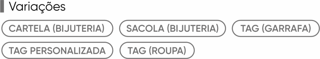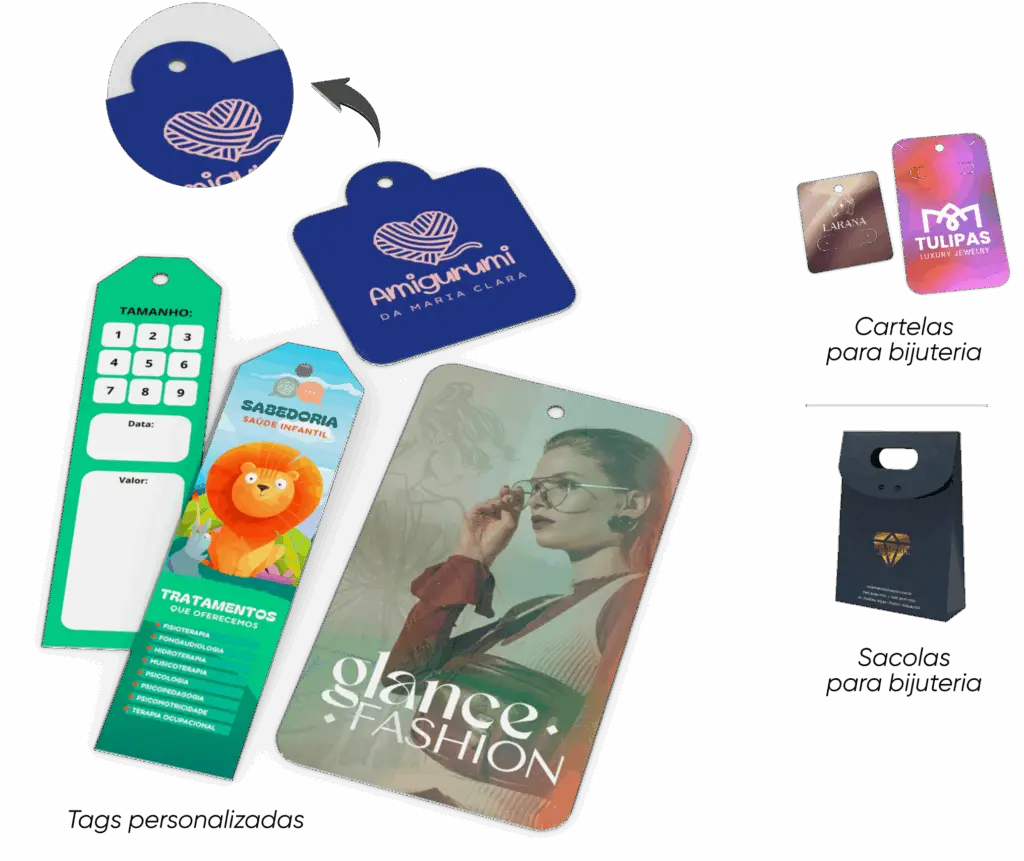 Perfeitas para agregar valor aos produtos, as tags e cartelas são uma forma elegante e prática para transmitir informações importantes, como preço, tamanho, instruções de cuidados e detalhe. Totalmente personalizáveis, as tags e cartelas possibilitam a utilização de acabamentos especiais e sofisticados para agregar ainda mais valor aos produtos.